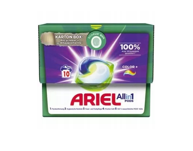 Ariel All in 1 PODS Color+ – kapsułki do prania tkanin kolorowych 10 sztuk to praktyczne i skuteczne rozwiązanie dla osób, które chcą szybko i łatwo zadbać o czystość i intensywność kolorów swoich ubrań. Każda kapsułka zawiera skoncentrowany detergent, który usuwa nawet trudne zabrudzenia, jednocześnie chroniąc barwy tkanin przed blaknięciem.