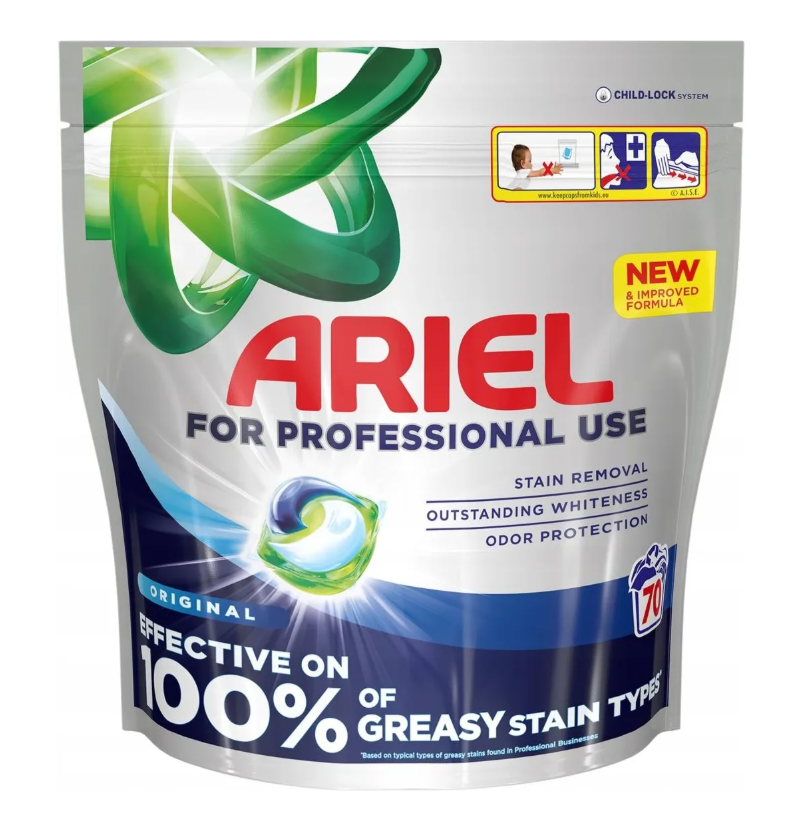 Ariel Professional All in One Pods Universal – kapsułki do prania 70 sztuk to wygodny i skuteczny sposób na czyste, pachnące ubrania. Każda kapsułka 3w1 usuwa zabrudzenia, chroni kolory i dba o włókna tkanin, zapewniając profesjonalną jakość prania bez konieczności odmierzania detergentu.