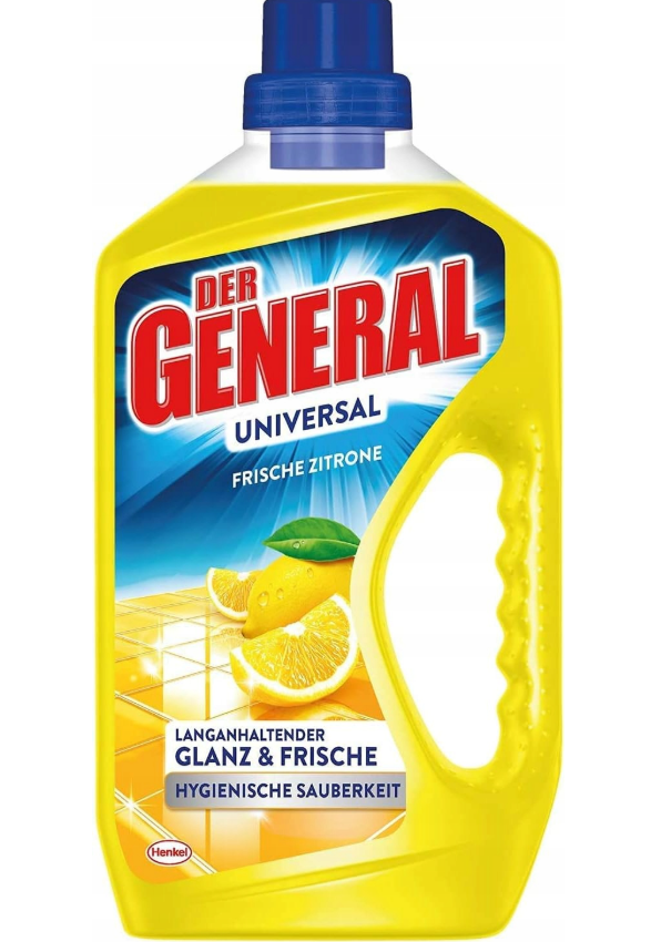 Uniwersalny środek czyszczący Der General Zitrone to skuteczny produkt do codziennego sprzątania domu. Dzięki formule opartej na cytrynie szybko usuwa brud, tłuszcz i osady, pozostawiając powierzchnie czyste, lśniące i świeżo pachnące.