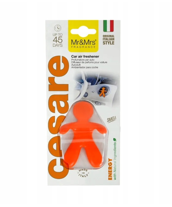 Stylowy odświeżacz do samochodu Mr & Mrs Fragrance Cesare Energy to połączenie nowoczesnego designu i energetyzującej kompozycji zapachowej. Charakterystyczna postać Cesare montowana na kratce wentylacyjnej nie tylko odświeża wnętrze auta, ale także stanowi elegancki i oryginalny dodatek.