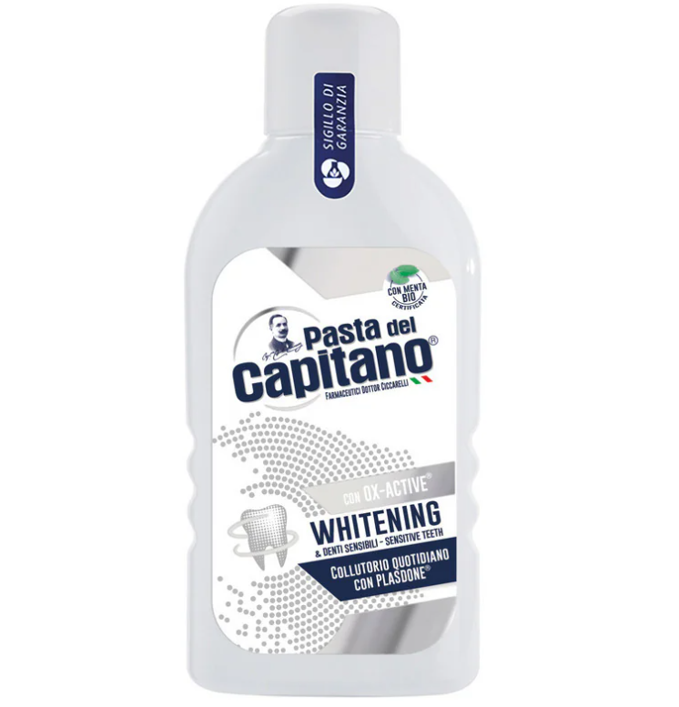 Pasta del Capitano Whitening – wybielający płyn do płukania jamy ustnej 400 ml to zaawansowany produkt do codziennej higieny jamy ustnej, który pomaga zachować naturalną biel zębów i świeży oddech. Formuła płynu została wzbogacona o składniki aktywne, które skutecznie redukują przebarwienia powierzchniowe, wzmacniają szkliwo i chronią przed powstawaniem osadu nazębnego.
