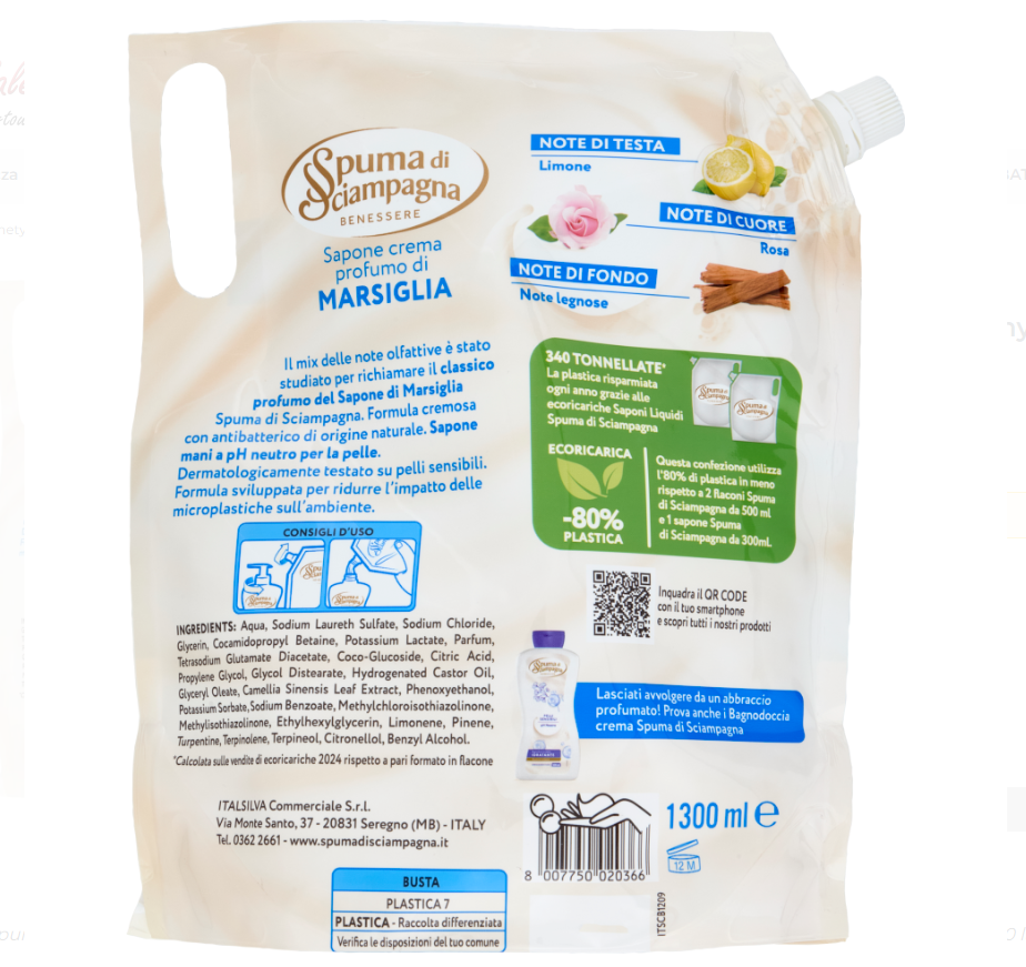 Spuma di Sciampagna Marsylia to delikatne mydło w płynie do codziennej pielęgnacji rąk, które zachwyca świeżym, klasycznym zapachem Marsylii. Jego łagodna formuła skutecznie oczyszcza skórę, nie wysuszając jej, pozostawiając dłonie miękkie, gładkie i przyjemnie pachnące. Duże opakowanie 1300 ml w formie uzupełnienia pozwala na ekonomiczne stosowanie w domu lub w miejscu pracy.